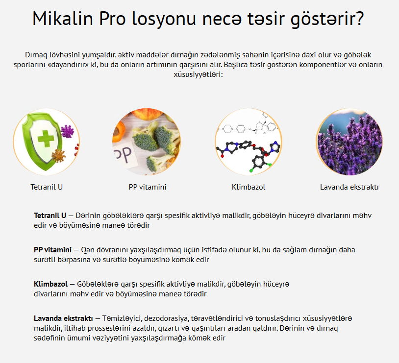 Mikalin pro xarici istifadə üçün nəzərdə tutulmuş bioloji aktiv əlavə kateqoriyasına aid losyondur. Məhsul 15 ml həcmində flakonda təqdim olunur və dəri və dırnaq səthinə birbaşa tətbiq üçün hazırlanıb. Tərkibində göbələk mənşəli problemlər zamanı istifadə olunan komponentlər mövcuddur.